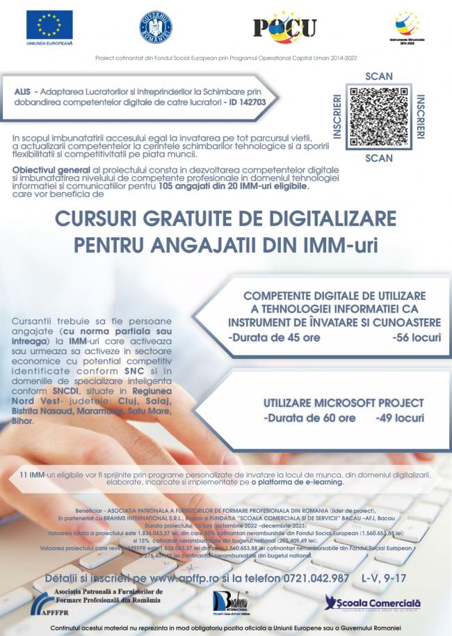 Asociația Patronală a Furnizorilor de Formare Profesională din România (APFFPR), adeptă a dezvoltării procesului de învațare continuă a adulților din România si a conceptului de digitalizare a activitatilor IMM-urilor, implementează proiectul “ALIS – Adaptarea Lucratorilor si Intreprinderilor la Schimbare prin dobândirea competențelor digitale de către lucrători”, pe care îl derulează în calitate de lider de proiect, în parteneriat cu BRAHMS INTERNATIONAL S.R.L., Brașov și FUNDAȚIA ''ȘCOALA COMERCIALĂ ȘI DE SERVICII'' BACĂU – AFJ, Bacau în perioada octombrie 2022 – decembrie 2023.